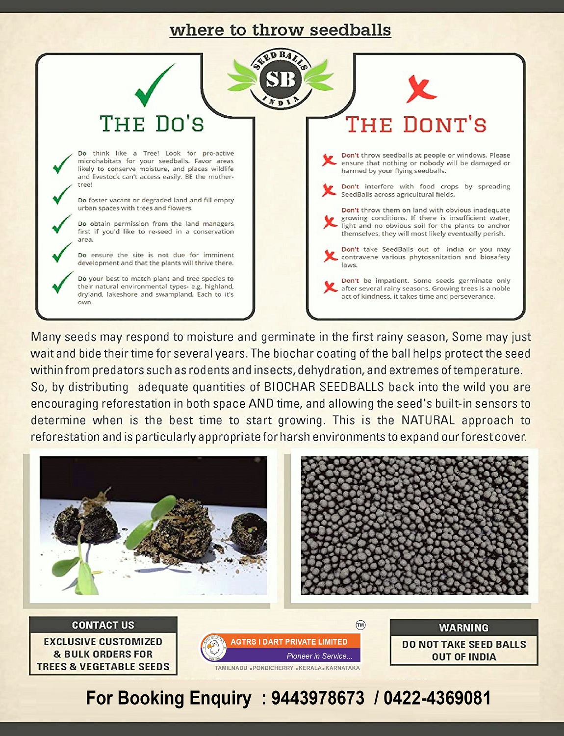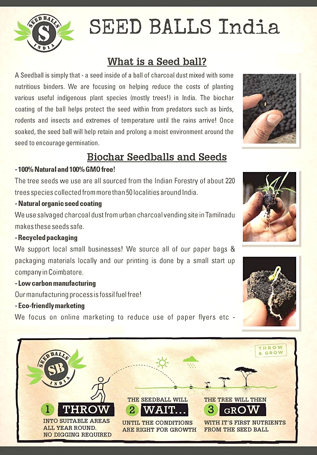 A seed ball (or seed bomb) is a seed that is wrapped in a mixture of clay and cattle dung or compost. The cattle dung or compost helps protect the seed from predators such as birds, rodents and insects and extremes of temperature till the rains arrive. Once soaked, the seed ball will help retain and prolong a moist environment around the seed to promote germination. Essentially, the seed is ‘pre-planted’ and can be sown by depositing the seed ball anywhere suitable for the species, keeping the seed safely until the proper germination opportunity arises. Seed balls are an easy way to grow trees with a longer germination time span. They are inexpensive and can be easily dispersed over large areas which are often hard to reach. Direct seeding reduces shock of transplanting saplings and helps the young trees grow stronger roots and hence stronger trees.